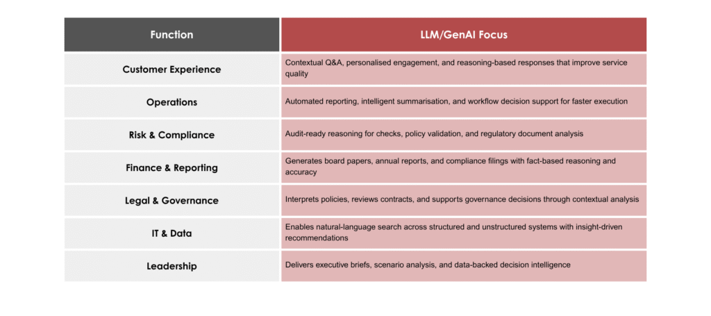 GenAI intelligently summarises complex information, reasons through context, and supports faster, data-driven decisions across every level of operation.